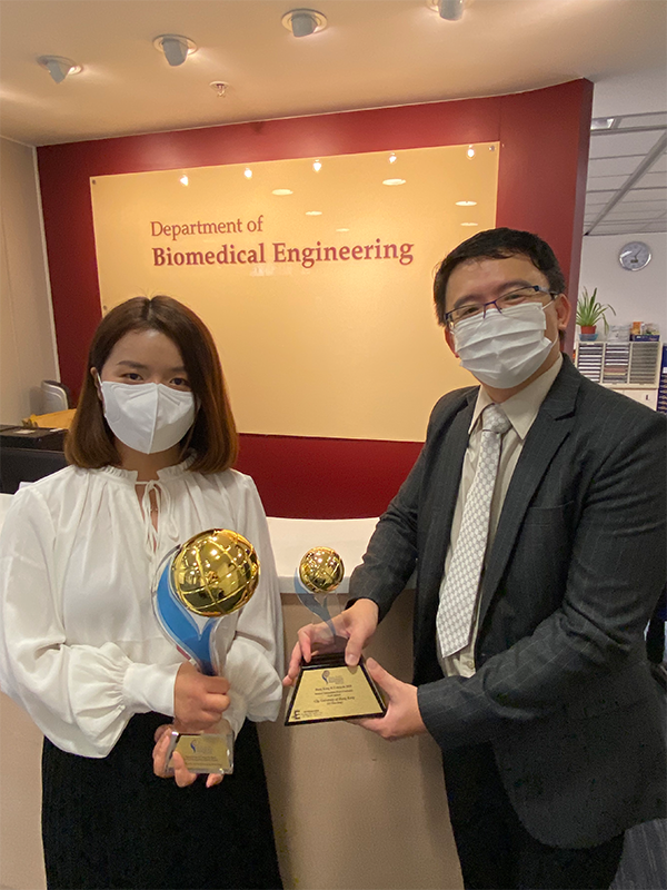 Congratulations to Miss Megan Xiaoting LI, PhD student of Dr. King LAI, for winning the Student Innovation Grand Award for their project "Flexible and Wearable Yarn-Based Strain Sensor" in Hong Kong ICT Award 2020. The Grand Award was presented by Mr. Alfred Sit, Secretary for Innovation and Technology of the Innovation and Technology Bureau. Earlier, Miss LI has been awarded Student Innovation (Post-Graduate) Gold Award for the same project.