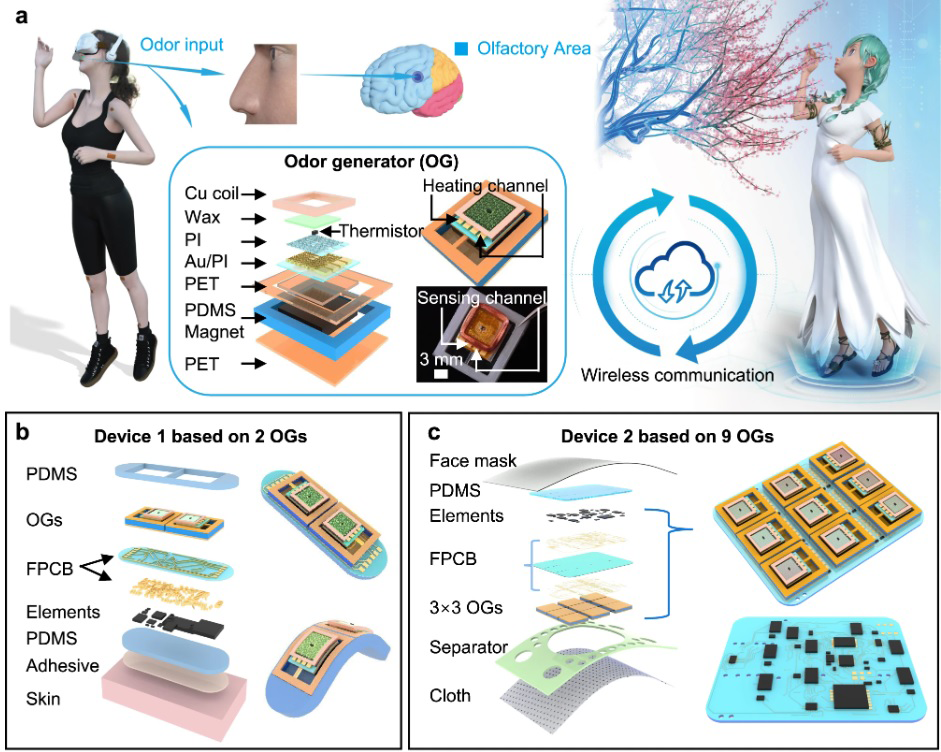 Dr YU Xinge and his collaborators in Beihang University developed two small, wireless wearable interfaces that bring smell into virtual reality. One can adhere to the skin between the nose and mouth like a bandage, while the other straps on beneath a headset like a face mask. The interfaces could be helpful for people who have anosmia, or an inability to smell.
