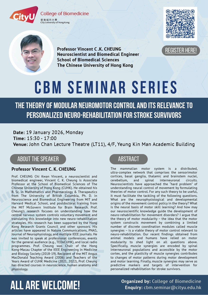 CBM SEMINAR SERIES: THE THEORY OF MODULAR NEUROMOTOR CONTROL AND ITS RELEVANCE TO PERSONALIZED NEURO-REHABILITATION FOR STROKE SURVIVORS