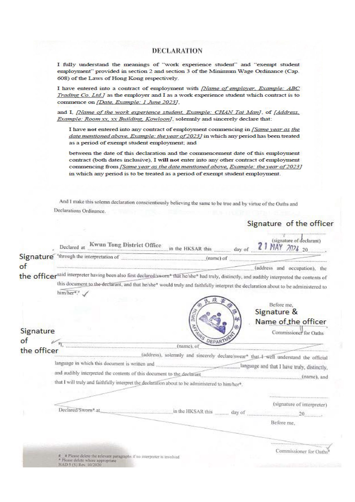 a) ITC STEM Internship Scheme - Offer Acceptance Form (College of Biomedicine) b) ITC STEM Internship Scheme - Declaration Form c) Confirmation of Student Status for “Work Experience Student” under the Minimum Wage Ordinance (Cap. 608) d) Statutory Declaration [Sample for reference only] [Specimen Content] obtained through Home Affairs Enquiry Centre NOTE: For details on making a declaration at the Home Affairs Enquiry Centres, please visit the Home Affairs Department’s webpage. Students are strongly advised to consult the relevant Enquiry Centre in advance to confirm the declaration service timeslot. e) No Objection Letter (NOL) [Sample for reference only] issued by the Hong Kong Immigration Department (for non-local students only) f) List of Student Interns with your particulars provided Backdate and late submissions will not be accepted. Only eligible applications will be processed. |