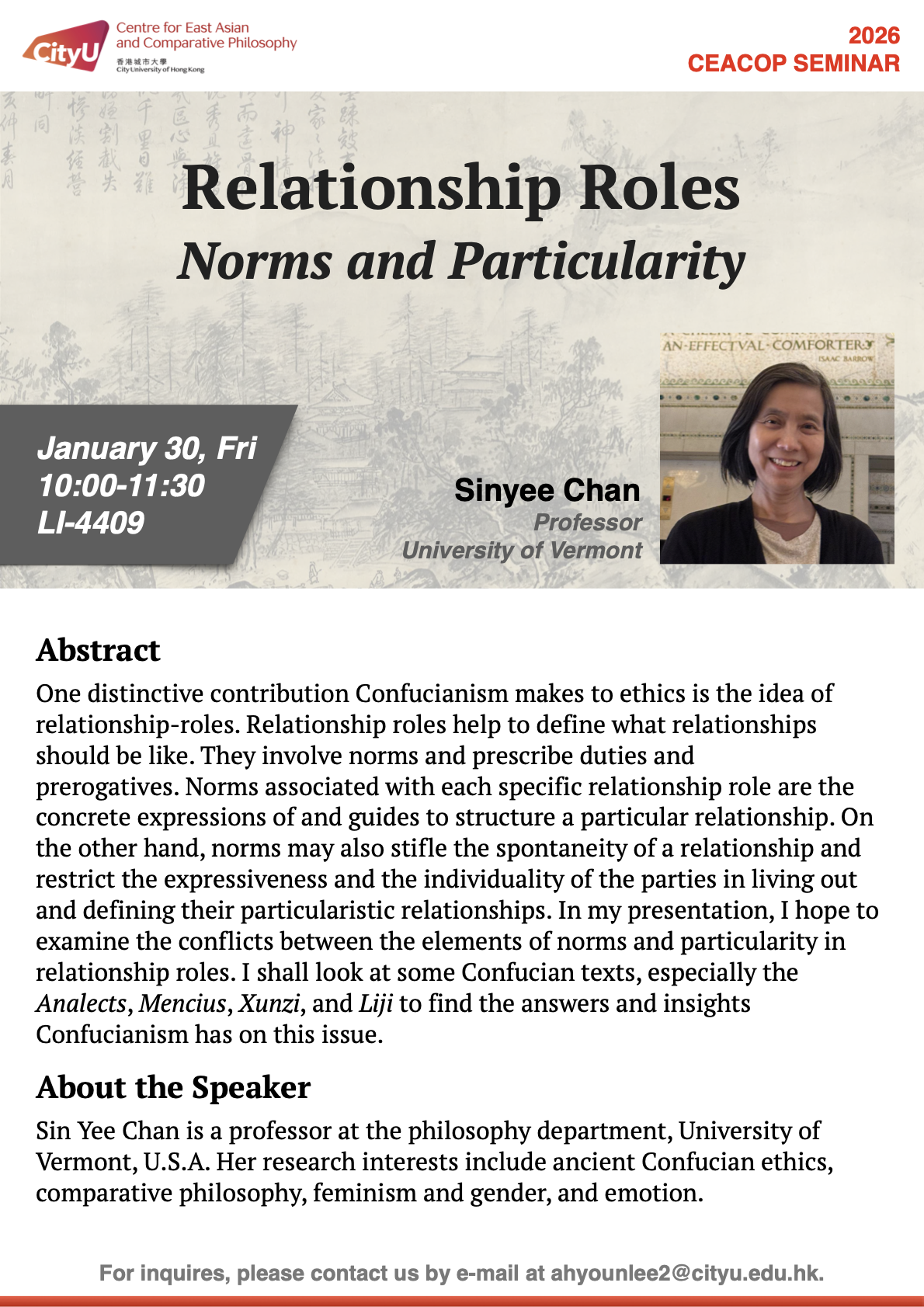 Center for East Asian and Comparative Philosophy (CEACOP), Rm 5522, Li Dak Sum Building, 83 Tat Chee Avenue, Kowloon Tong, City University of Hong Kong, Hong Kong, 🗺️(click)
