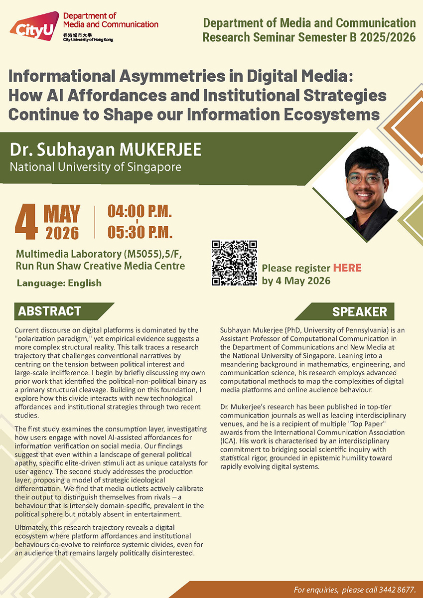 COM Research Seminar: Informational Asymmetries in Digital Media: How AI Affordances and Institutional Strategies Continue to Shape our Information Ecosystems