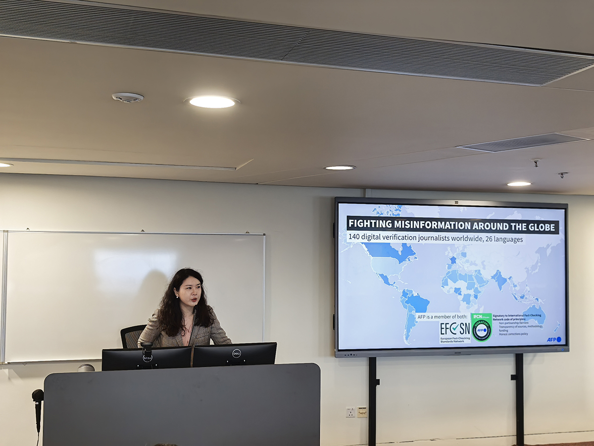 On October 23, 2025, Ms. Sophia Xu, the digital training manager for Asia-Pacific at Agence France-Presse (AFP), delivered a professional lecture entitled, “AFP Fact Check Initiatives and Multimedia Verification in the Age of AI.” Ms. Xu joined AFP in 2020 as a regional digital verification editor and has trained thousands of journalists and students at media conferences, press clubs, and universities across Asia.