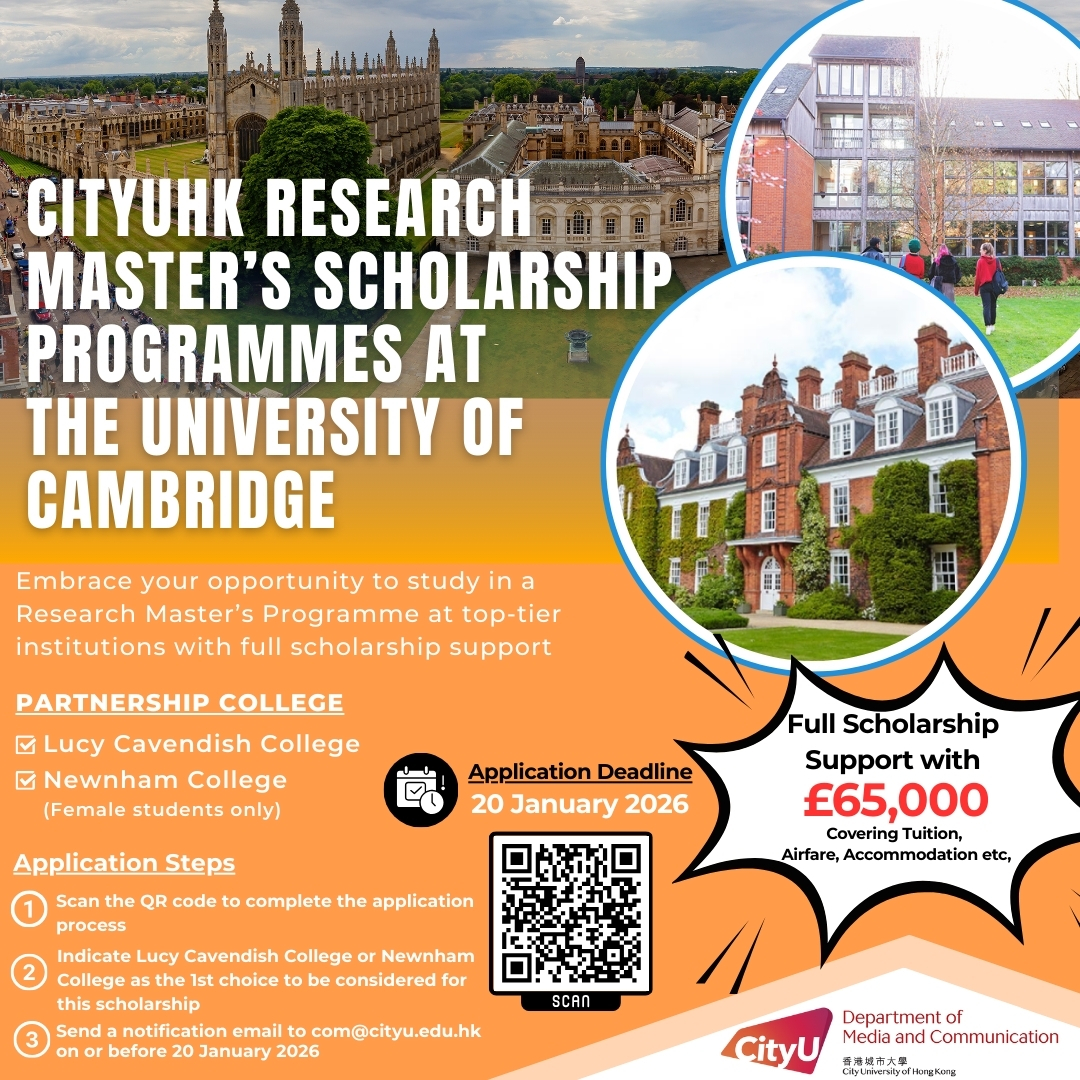 The Chow Yei Ching School of Graduate Studies (SGS) is now accepting applications for the CityUHK Research Master’s Scholarship Programmes at the University of Cambridge for the 2026–27 academic year. This initiative offers talented students the opportunity to pursue a one-year Research Master’s degree at Cambridge, serving as a gateway to a 4-year PhD program at CityUHK. The PhD will be undertaken with joint supervision by professors from both institutions.