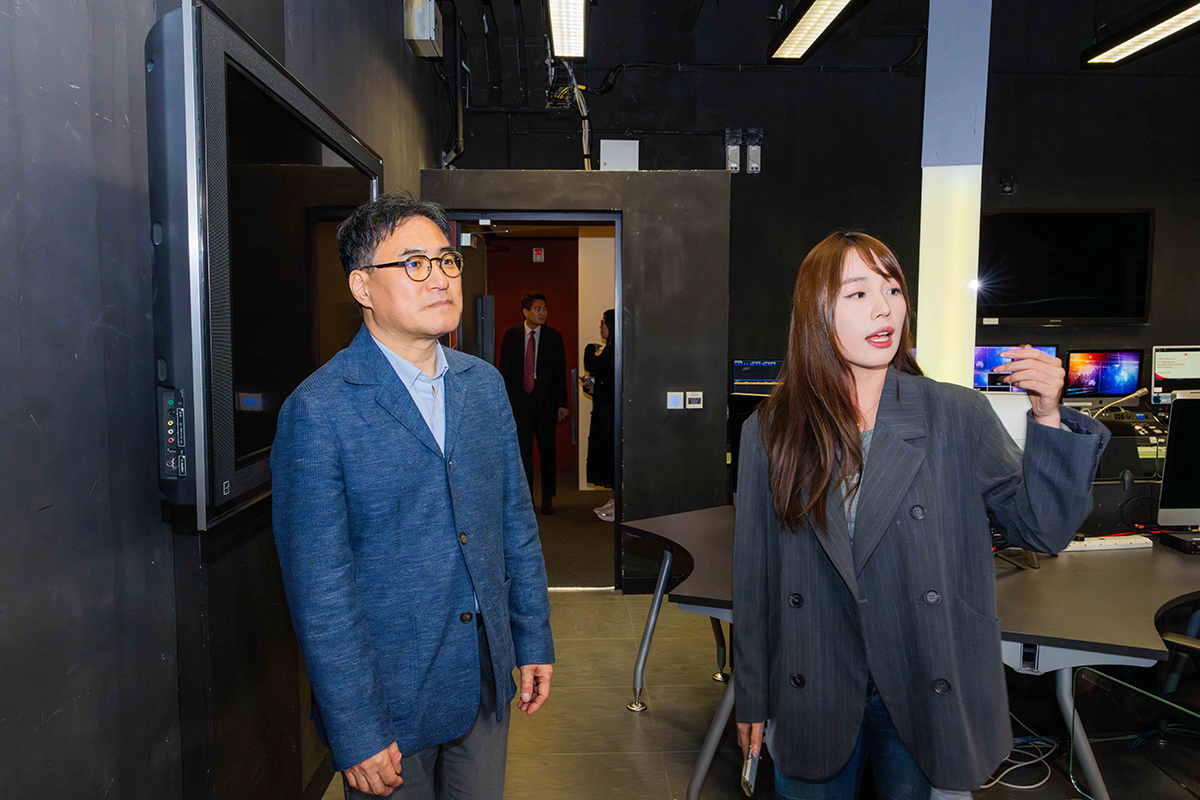To enhance his understanding of the department, Prof. KIM explored COM's professional teaching facilities, such as the Omnimedia Digital Newsroom, 3-D Virtual TV Studio, Advertising Design & Shooting Studio, and Digital Broadcasting Control Room.