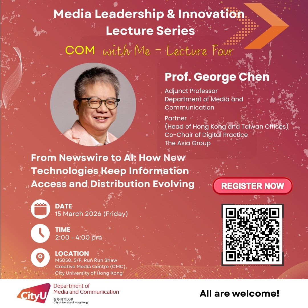 The COM Department is thrilled to announce the fourth lecture of “Media Leadership & Innovation Lecture Series: COM with Me.” This session will spotlight our Adjunct Professor George Chen, the Managing Director (Head of Hong Kong and Taiwan Offices) and Co-Chair of Digital Practice for The Asia Group.