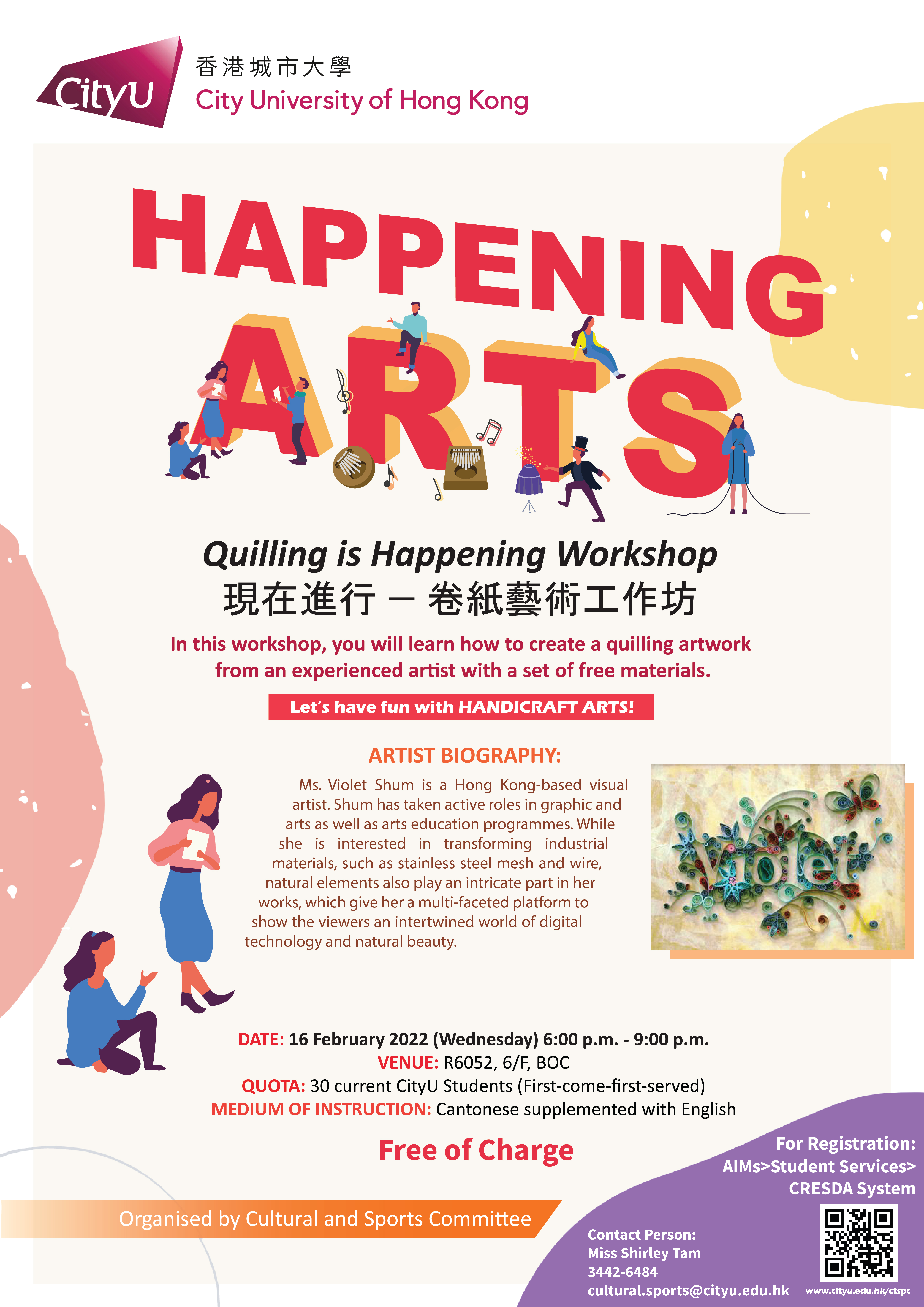 Online Registration Remarks: Each successful applicant have to collect a set of workshop materials at Student Development office prior to the workshop date. Details will inform the successful applicant individually. Enquiry Organised by Cultural and Sports Committee, City University of Hong Kong Click to enlarge. ↓ ![]() |