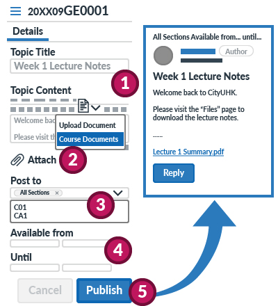 - By default, the announcement displays immediately after you publish it. However, you can set display dates between Available From and Until.