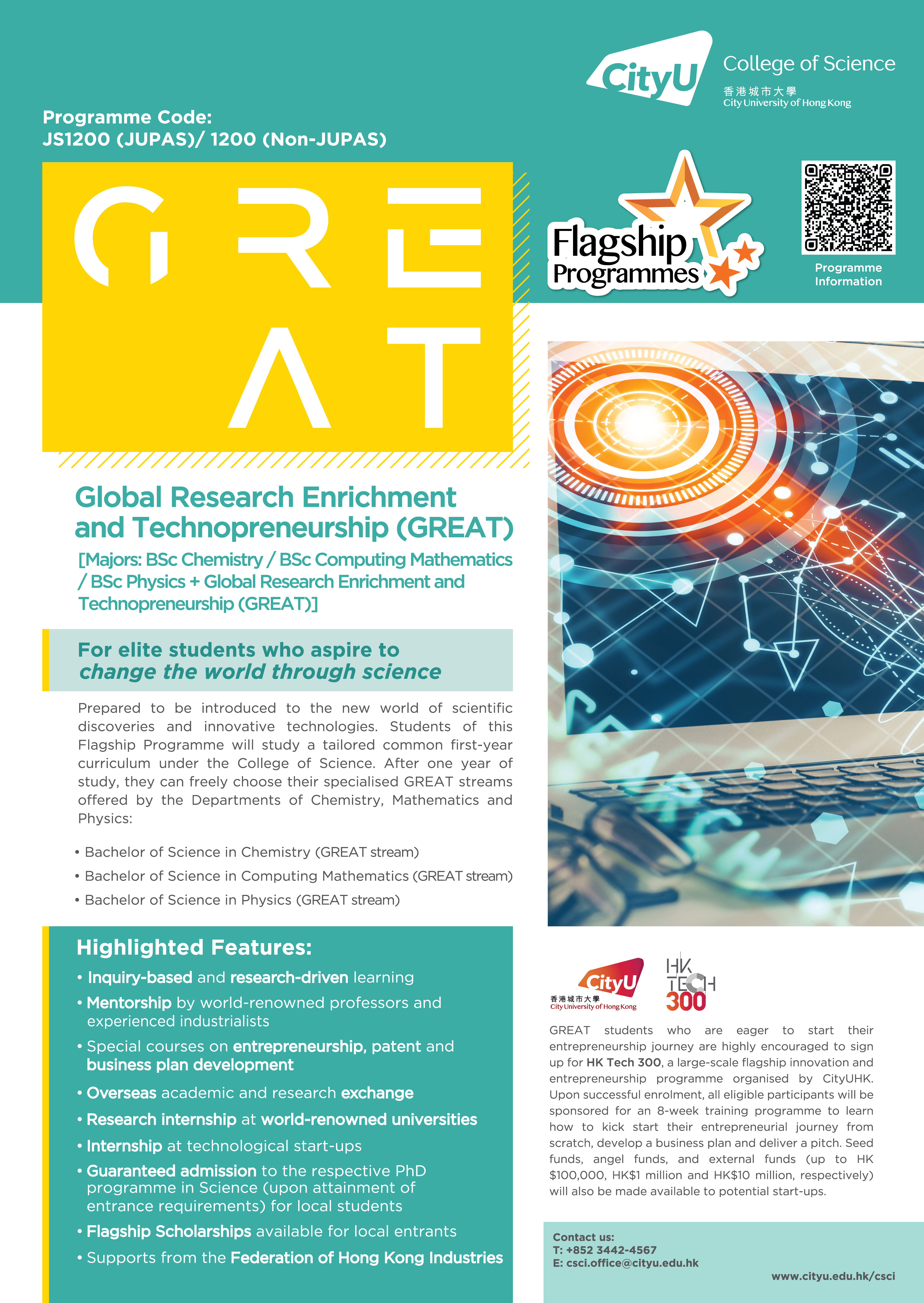 offered by CityUHK. GREAT is a 4-Year undergraduate option introduced in 2021/2022 aiming to nurture students who are interested in pursuing a career in scientific research or starting business ventures that involve the use of new scientific discoveries and innovative technologies. Students will be admitted to the College of Science and study a tailored common first-year curriculum. After one year of study, students will have a free choice of GREAT streams offered by the Departments of Chemistry, Mathematics and Physics.