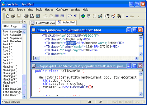 TextPad has been implemented according to the Windows XP user interface guidelines, so great attention has been paid to making it easy for both beginners and experienced users. In-context help is available for all commands, and in-context menus pop-up with the right mouse button. The Windows multiple document interface allows multiple files to be edited simultaneously, with up to 2 views on each file. Text can be dragged and dropped between files.