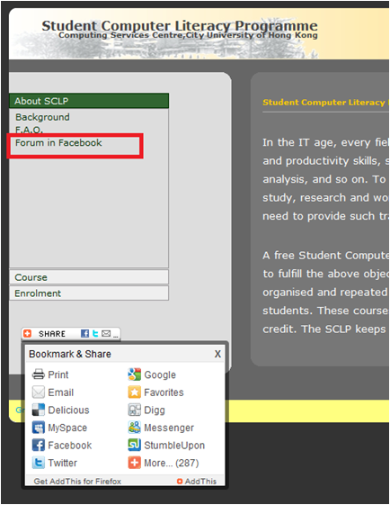 In an attempt to incorporate Web 2.0 elements into the new website, an AddThis link is included to facilitate the sharing of information. There is also a link to the SCLP FaceBook group where users can discuss and subscribe SCLP news.