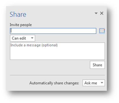 A Share buttoncan be found at the top-right corner of the ribbon of the Office components to simplify sharing. You can share your file easily by pressing the button and invite others to work on it. Different access rights – view/edit can be assigned to individuals. A head count of people who are viewing or working on the file will also be shown on the Share button