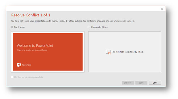 The new Office allows multiple editing on a file at the same time. When two or more people are working on a file simultaneously, their intended changes might conflict with each other. A side-by-side visual comparison between your changes and the conflicting changes by others will be shown so that you can choose the slide with the changes you would like to keep before saving the file.