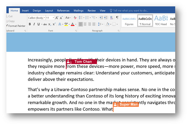 Now you can collaborate on documents in real-time with others in Word and see the works of others online. If you are in the document at the same time with others, you can watch what the others are working on and view their edits as they happen. A coloured flag represents each person and where they are editing in the document as shown below.