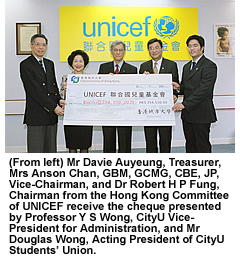 Professor Y S Wong, Convenor of the CityU Support Group for South Asian Tsunami Victims, and Mr Douglas Wong, Acting President of the Students’ Union, presented a cheque to UNICEF on 24 January. The cheque was received by Hong Kong Committee of UNICEF Council Members Dr Robert H P Fung, Chairman, Mrs Anson Chan, GBM, GCMG, CBE, JP, Vice-Chairman, and Mr Davie Auyeung, Treasurer.