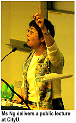 Kong’s Legislative Council, was welcomed to CityU by Professor Peter Malanczuk, Dean and Professor (Chair), School of Law (SLW). Ms Ng’s presentation, Just Law: Do Laws in Hong Kong Necessarily Promote Justice?, was the second in the SLW’s Eminent Speakers Lecture Series providing a public forum in which the University can interact with the wider community on issues that are relevant to our times and promote intellectual discourse among scholars and students at CityU.“The law is everybody’s business,” Ms Ng noted. “And law is not at all the same thing as justice. One aspect of law is regulatory, but I’d like to talk about law in connection with justice and the rule of law… Law is a human institution—our endeavour to approximate justice. What is justice? There is such a thing as a ‘sense’ of justice—an evenness, a harmony, or a ‘fair share’ idea. The Greeks imagined it as a state of