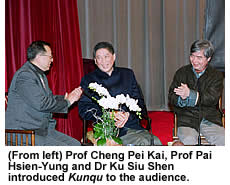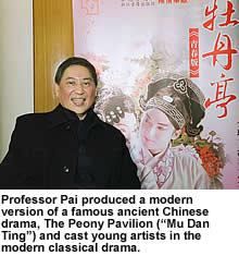 Professor Pai has been promoting Kunqu over the past few decades. Recently, he produced a modern version of a famous ancient Chinese drama, The Peony Pavilion (“Mu Dan Ting”) and cast young artists in the modern classical drama. At the invitation of the CCIV, Professor Pai brought with him artists from the Suzhou Kunqu Theatre to demonstrate the beauty of Kunqu in CityU's Wei Hing Theatre. Professor Pai plans a roving performance of Kunqu in various universities on the mainland.