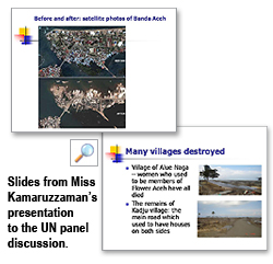 As part of its 49th Sesssion of the Commission on the Status of Women from 28 February to 11 March, the United Nations Development Fund for Women (UNIFEM) organised a panel discussion, “From Vulnerability to Empowerment: Women at the Heart of Tsunami Recovery”, in New York City. In recognition of her invaluable contribution to the understanding of issues faced by women in Aceh both before and after the December 2004 tsunami in South Asia, UNIFEM invited Miss Suraiya Kamaruzzaman, Research Fellow in CityU's Southeast Asia Research Centre (SEARC) to participate as one of the panelists. "Miss Kamaruzzaman's participation in the UNIFEM forum is further evidence of SEARC's outstanding success since its launch less than five years ago," observed Professor Ian Holliday, Dean of CityU's Faculty of Humanities and Social Sciences. "The Centre has already established a global reputation for high-quality research on the key region of Southeast Asia and is moving from strength to strength."