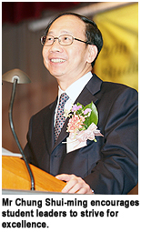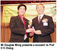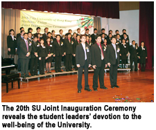 Professor H K Chang, CityU President, wished the 20th SU success , reaping the harvest it sows, and deriving satisfaction from serving others. “What you've inherited is the University’s splendid achievements of our staff and your predecessors during the past two decades. As you students are all ambassadors of the University, I wish you to work with our staff and your fellow students to reach new heights for the University,” Professor Chang said. He also encouraged the students to cherish the experience of being SU leaders, as "not only an obligation, but a good opportunity to learn about leadership and team work”.