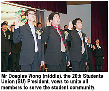 In his inauguration speech, Mr Wong mapped out the future plan of the SU in four main areas – "social awareness, harmony, belongingness and university reputation". He committed himself to cultivating harmonious relationships with various parties and, above all, he urged the SU body "to serve with pleasure" as the most important criterion for success.