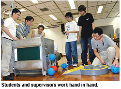 To prepare for the contest, the four teams have recently performed trial manoeuvres and have been working hard on combat tactics. “As our team members come from the Departments of MEEM, IT and EE,” said Cyrus Wong Chun-yin, one of the participating students, “our hand-made robots are masterpieces combining our expertise in electronic technology, computer programming and manufacturing engineering. We feel very honoured to represent the University in this contest.” He is also grateful to the supervisors who work so hard – even missing out on sleep – to develop strategies together with the students.