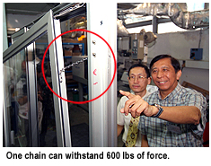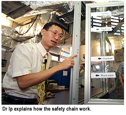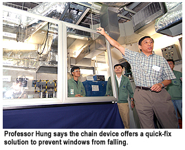 Using simple materials of steel chain and clinchnuts, Chair Professor Michael Hung and Dr Ralph Ip of the Department of Manufacturing Engineering and Engineering Management have designed a safety chain fixture that can prevent aluminium windows from falling. The researchers embarked on the project upon invitation by the Housing Department, HKSAR, to tackle the problem of falling window frames, after a number of such incidents occurred in town in recent months. Easy-to-install and unobtrusive, the safety chain offers a practical and inexpensive quick-fix solution to prevent problematic windows from falling.