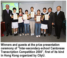 In order to promote "Jyutping" and the underlying message concerning more accurate Cantonese pronunciation, and to encourage the use of the Scheme in areas of information technology, CTL collaborated with the Linguistics Society of Hong Kong and LangComp Company Limited to organize the “Inter-secondary-school Cantonese Transcription Competition 2005”. The Competition was divided into Junior Group and Senior Group. The teams first attended a workshop at CityU to understand “Jyutping”, and then entered the competition. Three participants from each group were chosen to compete for the Champion in the Final Round. The results (please refer to the attached) were announced, followed by an award presentation.