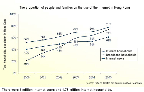 The survey reveals that Internet users made up more than 60% of the local population, up from 40% in 2000. Of them, 92% used broadband services. The number of families using broadband also rose from 40%to 94%, putting the territory in a leading position in both Asia-Pacific and worldwide.