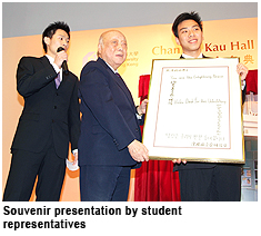 At the ceremony, student representatives from Chan Sui Kau Hall presented Dr Chan with a painting emboldened with the message “You are the Enlightening Beacon”. Written in Chinese, English, German, Korean and Indian languages, the work signifies the characters of Chan Sui Kau Hall: cultural diversity and cross-cultural goodwill. After the presentation, student representatives invited Dr Chan to a cake-cutting ceremony that celebrated the ‘birth’ of the Hall. In the evening, Professor Chang and Dr Chan attended the Hall’s annual High Table Dinner, which was organized by residential students under the theme One World (齊家). Professor Chang told students at the beginning of his keynote speech that no better theme could be chosen. “This is a globalized world and we live in a global village. But I believe we are joining the family of humanity not to forget our own roots and traditions, but to add our own theme,” he said. 齊家 (One World) means, according to Professor Chang, keeping the family intact. He is convinced that the Chinese cultural tradition, in particular family values, is very much needed around the world today. “I cannot think of a better practitioner, a better believer in the concept of 齊家 (One World) than Dr Chan. Therefore we are very proud to name one of our Halls in his honour. I hope, in due time, the Chan family will be proud that they have made this major contribution to CityU because of our students’ contributions to society,” he said. Hall residence is part of the University’s efforts to provide student-based education. By letting students study and live in a culturally diverse environment, the University wishes to help students further enhance their communication and people skills and develop a broad knowledge base to cope with future challenges. Presently, CityU has 10 student hostels with a capacity to accommodate a total of about 3,000 students. Chan Sui Kau Hall has 318 student residents, one-third of whom are non-local. |