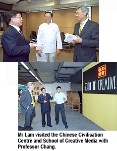 During a guided tour of the Chinese Civilisation Centre and School of Creative Media with Professor Chang before the Forum started, Mr Lam said he was impressed by CityU’s developments and achievements. Enthusiastic about education, Mr Lam not only makes donations to the education sector, he is also a member of the Council of Jinan University, a visiting professor at South China Normal University, a member of the Advising Committee of Business Programmes at Lingnan University, and an adjunct professor at CityU’s Faculty of Business.