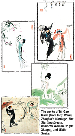 The exhibits showcase Mr Gao's unique style of blending the bold brush stroke commonly found in cartoon art with the delicate art of Chinese brush painting. He draws reference from characters and scenes in Chinese opera and incorporates his own free-style ink and wash stroke.