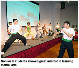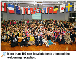 In an international atmosphere similar to that of the United Nations, the City University of Hong Kong (CityU) held a welcoming ceremony for the newly arrived non-local students last Friday (8 September). More than 400 new students coming from 20 provinces and municipalities of mainland China, as well as 20 overseas students, spent a memorable night together, watching a spectacular martial arts performance and participating in games that involved the use of different languages.