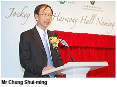 Speaking at the Jockey Club Harmony Hall naming ceremony today (26 October), Mr Chung Shui-ming, Chairman of the University Council of CityU, said upon completion of the first three phases of the Student Hostels Project, the University was able to provide accommodation for some 2,900 students in nine blocks of residence. The Project not only represented a milestone that was transforming CityU into a residential University, it also added a new dimension to learning that facilitates greater whole-person education.