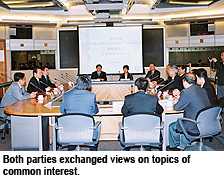 CityU faculty deans and department heads exchanged views with the delegation on converting innovations in technology into commercial products, a topic that interested both parties. Professor Tong asked Professor Han to talk about successful mainland practices in this area, while Professor Luk Kwai-man, Head of the Department of Electronic Engineering, talked about the efforts CityU was making to identify potential customers in Qingdao, Shandong province, to convert antenna and radio frequency circuitry, which is US-patented, into commercial products.