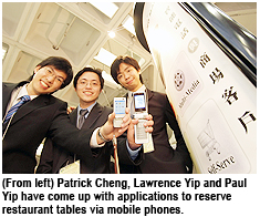 One of the projects, "Smart Phone and Customer Relationship Management Solution for Shopping Mall", has been developed by three students, Patrick Cheng Chun-choi, Paul Yip Cheuk-wing, and Lawrence Yip Kai-on. With inspiration from daily living, they come up with this application for customers in shopping malls to shop with mobile phones such as looking for shopping tips, finding the location of stores, booking tickets, and even reserving tables in restaurants. Restaurants in turn would notify customers by mobile phones about their queuing status. This can save customers the trouble of getting queuing tickets in person or queuing up outside restaurants.