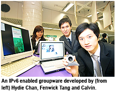 Another project, "Personalized IPv6-based Peer-to-Peer Group-Interaction Applications", has been developed by Calvin Chan King-fung, Hydie Chan Wing-yan, and Fenwick Tang Yan-kin. They make use of the latest Internet-based (IPv6) technology to enable groups of individuals at different locations to discuss business via video conferencing without being restricted by time zone or geographic location. The unique feature of this system is that it does not require a computer server and yet it provides a platform for very secure, eavesdrop-free communication.