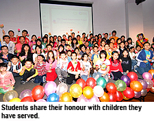 The project aims to foster a sense of social commitment and to build self confidence among the students. Key beneficiaries include children who require constant care, those from deprived, single parent or new immigrant families, and elderly people who live alone. More than 260 people benefited from the project in the current academic year.