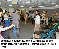 | CityU will provide once again local secondary school principals and teachers with the opportunity to upgrade their qualifications and subject knowledge through the Teachers Update Course 2007 (TUC) programme. This year more than 2,500 participants will attend 40 sessions at TUC, tallying up to 7,500 hours of professional development time. These hours go towards credits for Continuing Professional Development, as required by the Education and Manpower Bureau.