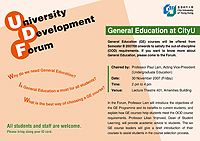 A University Development Forum will be held on 30 November, from 2pm - 4pm, at LT401, to introduce to students and staff the objectives of the GE Programme, its benefits to current students and to explain how GE courses help students meet the OOD course requirements. Professor Lam will chair the forum, while Professor Vrijmoed will provide academic advice to students. The six GE course leaders will give a brief introduction of their courses to assist students in the course selection process.