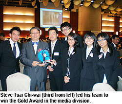 Steve Tsai Chi-wai, also a Year 2 student in the Department of Marketing, led his team to win the Gold Award in the media division. He said the Department always encouraged students to take part in competitions and activities to acquire practical experience so he teamed up with six other business and creative media students to compete in the Young Marketing Communicators Award.