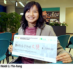 Heidi Li Yin-fung, a Year 2 creative media student at City University of Hong Kong (CityU), was crowned champion in the youth DV category in the International Youth Video and Photography Contest for her production entitled Can I Sit Beside You.