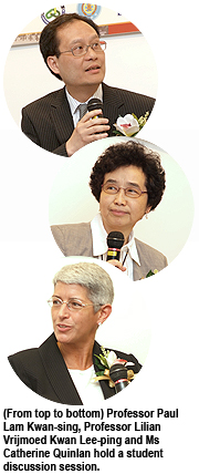 A discussion session at the award ceremony, in which students explained their research and the work that went into it, was hosted by Professor Paul Lam Kwan-sing, Acting Vice-President (Undergraduate Education); Professor Lilian Vrijmoed Kwan Lee-ping, Dean of Student Learning: and Ms Catherine Quinlan, Dean of the University of Southern California Libraries. Department heads or delegates presented the certificates to students.