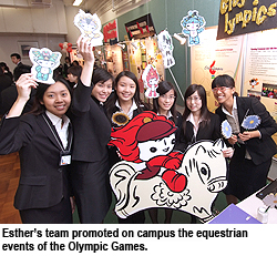 Promoting on campus the equestrian events of the Olympic Games was the mission of the team led by Esther Nip Ming-wai. After careful planning with the host organisation, Equestrian Event (Hong Kong) of the Games of the XXIX Olympiad Co. Ltd, Esther’s team organised a talk show, an exhibition and a lecture series under the campaign banner, City-lympics.