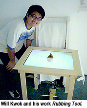 Despite the game’s apparently aggressive overtones, Will is keen to use it to make a poignant commentary on social issues. “There is now a serious disparity between the rich and the poor, with workers around the world being exploited by employers. While amassing tremendous resources, big corporations not only reap the resources but also stop others from ever accessing much-needed material gain. It is very similar to what we will do with a piece of unwanted cake. We are not only unwilling to share it with the ants but will even kill them ruthlessly. Ironically, in our life, we are actually in the same situation as the ants,” said Will. He argued that there was really little difference between human society and the world of nature but many people failed to realise this. Chris Cheung Hon-him and Jason Lam Chi-fai, both Year 3 undergraduates of SCM, made use of new media technology to produce an interactive installation work entitled Pixsonic Playground. Their creation can isolate and extract image elements and transform them into music and motion. Participants of the game need to first select an image from a series of images and videos provided by the website Flickr. Then, when they step into a space where the image is projected and move their bodies, a small square on the image will rotate and produce musical tones.“There are more rules and constraints for the composition of traditional music. But our work breaks these rules and allows more variations of composition. This is just the idea of ‘breaking the old rules’, as advocated by SCM,” said Chris. His teaming up with Jason was an opportunistic move, as Chris loves playing music and Jason excels in using different media technologies to create multimedia artworks.