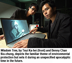 The award-winning animation Wisdom Tree, by Benny Chan Siu-chung and Tsui Ka-hei, depicts the familiar theme of environmental protection but sets it during an unspecified apocalyptic time in the future. It tells the story of a girl who joins protests against a mega-corporation that undertakes many construction projects that seriously damage the environment. The girl is arrested and imprisoned. In order to escapes, she takes a drug given to her by an old tree but still perishes in the end. Tsui Ka-hei said the work was intended to criticise the destruction of the environment by global corporations.There were six entries in the Single-Screen-Based Interactive Media Category and 10 in the Animation Category selected for this year’s ifva awards. Mr Byran Chung Wai-ching, Lecturer of SCM and one of the adjudicators of the Single-Screen-Based Interactive Media Category, said he was optimistic about the future of the new media industry in Hong Kong. “New media technology can now be applied to many areas, including construction, personal and household items and entertainment,” said Byran. However, he indicated that many local products were still only following overseas trends. He said different organisations, including educational institutions, the government and investors, should work together to formulate a long-term strategy to promote the development of new media creative works so that this budding industry could prosper.