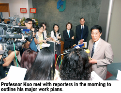 Professor Kuo met with reporters in the morning to outline his major work plans. Many important challenges await his leadership. High on his agenda is the enhancement of quality in both teaching and research. The University has embarked on an ambitious programme of physical expansion to accommodate the expected surge in undergraduate enrolment under the new 334 academic structure slated for 2012. An increase in size, he believes, must be accompanied by an improvement in quality, with clear benchmarks for validation.