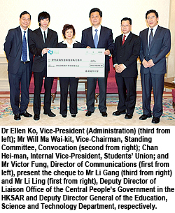 Thanks to the generosity of staff, students and alumni, the University has raised HK$448,046 in less than two weeks for victims of the Sichuan earthquake. Dr Ellen Ko Law Yin-lan, Vice-President (Administration), and representatives of alumni and students, presented the cheque to the Liaison Office of the Central People’s Government in the Hong Kong SAR on 4 June to support the rebuilding of primary schools in the affected areas.