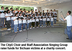 The strong passion of the CityU community for helping the victims continues. On 3 June, the CityU Choir and Staff Association Singing Group, with about 70 members, presented 20 songs at a charity concert on campus. In only 90 minutes they raised HK$55,939 for Hong Kong Red Cross. In addition, the CityU Philharmonic Orchestra will participate in a charity concert organised by the China Literacy Foundation on 5 June at St John’s Cathedral to raise fund for the people of Sichuan.