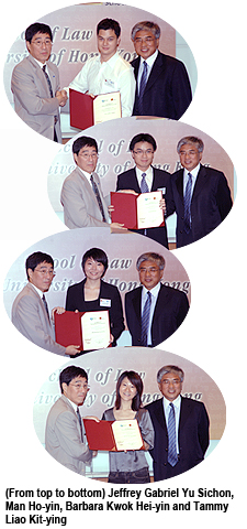 The award-winning students: Jeffrey Gabriel Yu Sichon received second prize in the Best Oralist category of the Philip C. Jessup International Law Moot Court Competition (Hong Kong Regional Rounds); Barbara Kwok Hei-yin, Tammy Liao Kit-ying and Man Ho-yin were honoured as a Top 10 Memorial Team in The Red Cross International Humanitarian Law Moot; So Wing gained an Honourable Mention in the Best Individual Oralist section of The Willem C. Vis International Commercial Arbitration Moot; and Juno Pang Kit-lai earned an Honourable Mention in the Best Oral Advocate category of The Willem C. Vis (East) International Commercial Arbitration Moot.