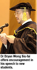 Dr Bryan Wong Siu-fai, Vice-chairman of CityU Convocation, delivered a speech on behalf of CityU Convocation. He pointed out that the aim of establishing CityU Convocation was to consolidate alumni and organise and coordinate their support of the university’s development. “CityU students should be proud of CityU. Starting from today, each of you represents CityU. Let’s try our best to work towards an even better and brighter future for CityU,” said Dr Wong.